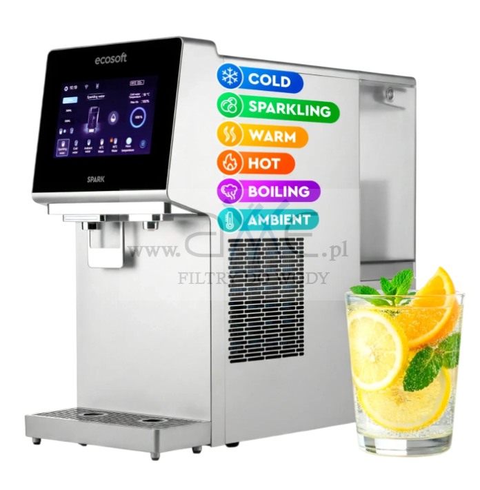 Ecosoft SPARK — inteligentny nablatowy dystrybutor wody z odwróconą osmozą to kompaktowy system „wszystko w jednym”, który dostarcza czystą, świetnie smakującą wodę w wielu wariantach: zimną, letnią, gorącą, wrzącą oraz gazowaną schłodzoną. 4-stopniowa filtracja RO usuwa do 99 % zanieczyszczeń, zapewniając wysoką jakość wody na co dzień w domu lub małym biurze. Kolorowy ekran dotykowy ułatwia sterowanie temperaturą i objętością dozowania, a monitorowanie TDS i stanu filtrów w czasie rzeczywistym pomaga kontrolować jakość wody.